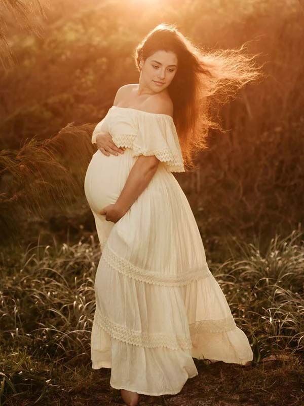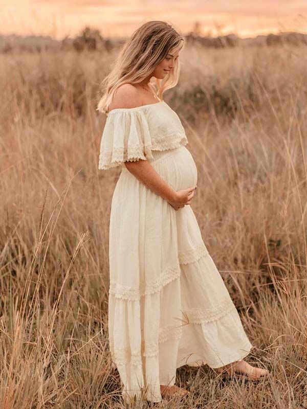 Momyknows Ivory White Off Shoulder Lace Ruffle Big Swing Boho Maternity Maxi Dress