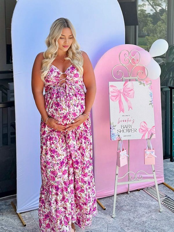 Momyknows Pink Print Bohemian Pleating Maternity Photoshoot Maxi Dress