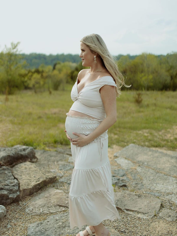 Momyknows Solid Color Bohemian Off Shoulder Backless Ruffle 2 piece set Photoshoot Maternity Maxi Dress