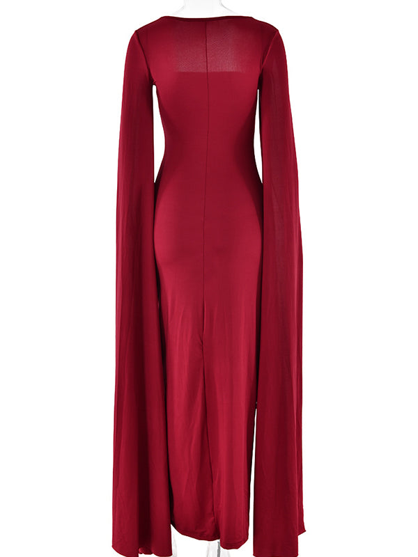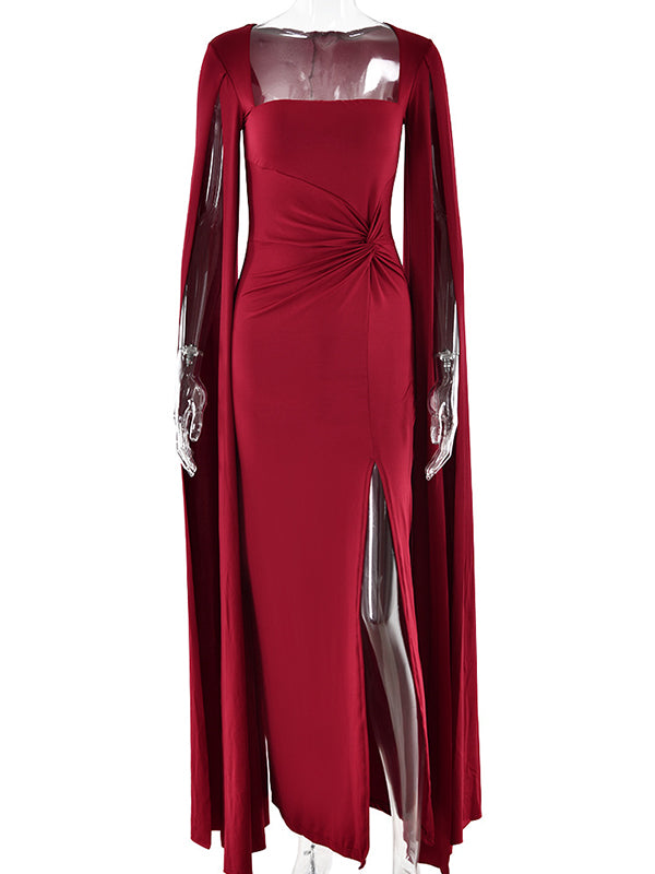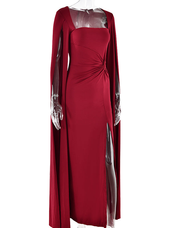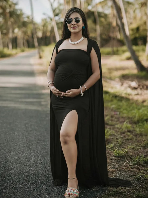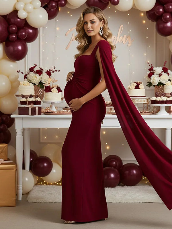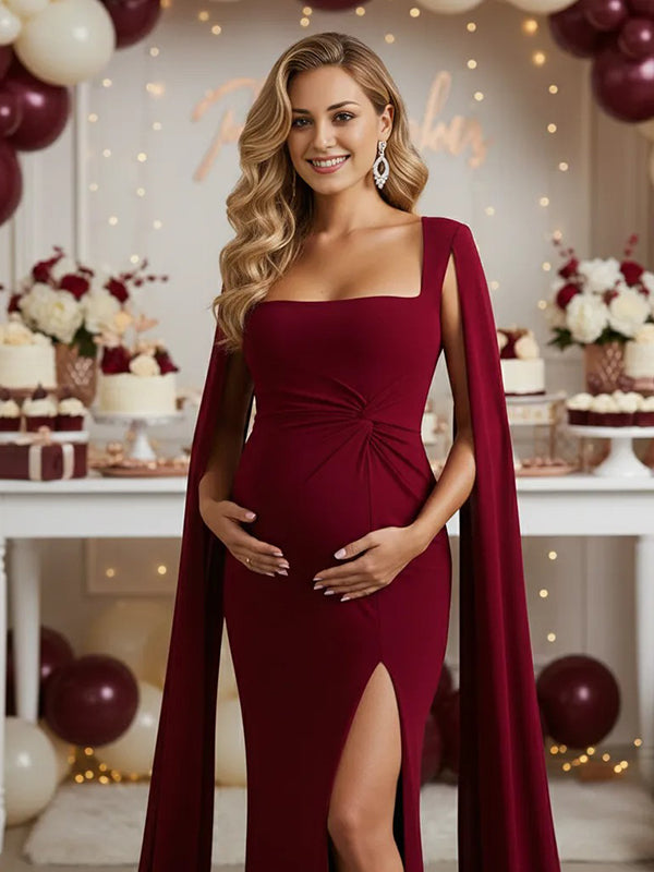 Momyknows Ruched Twisted Knot Side Slit Shoulder Padding Cape Sleeve Maternity Maxi Dress