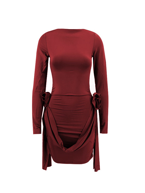 Momyknows Burgundy 3D Flowers Draped Ruched Bodycon Elegant Christmas Going Out Maternity Mini Dress