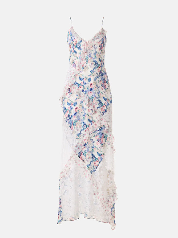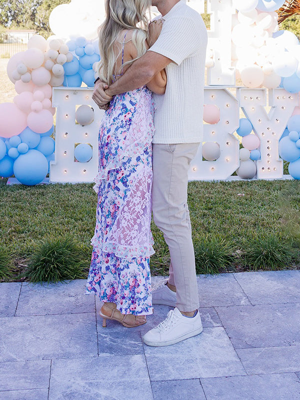 Momyknows Chic Blue Floral Lace Ruffle Tie Back Backless Floral Baby Shower Maternity Maxi Dress