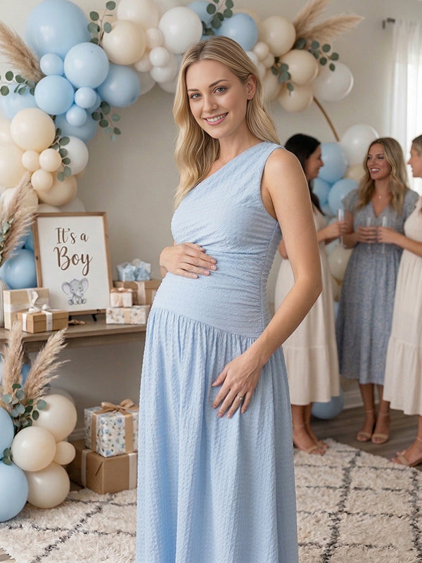 Momyknows Blue One Shoulder Ruched Draped Baby Boy Shower Maternity Maxi Dress