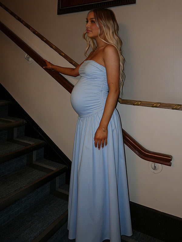 Momyknows Chic Blue Bandeau A-Line Photoshoot Baby Shower Maternity Maxi Dress