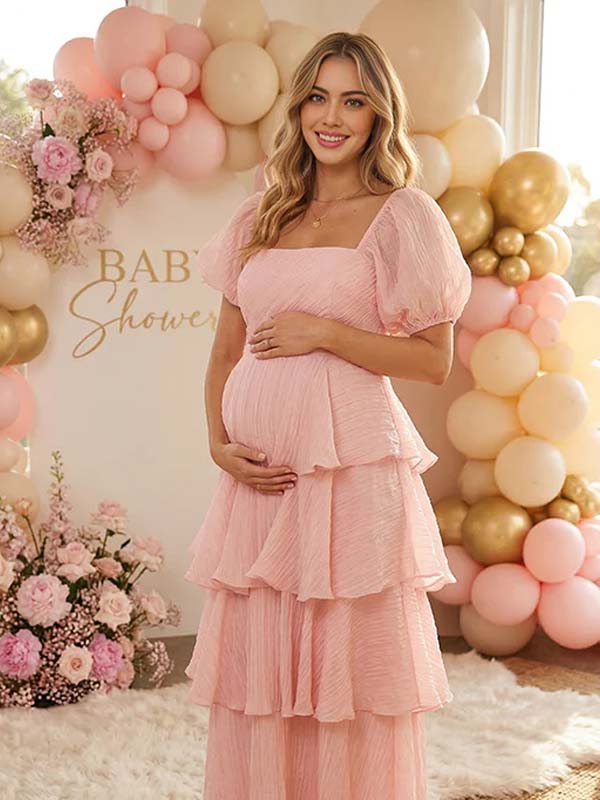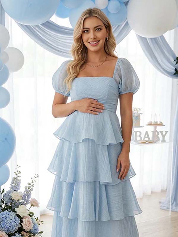 Momyknows Layered Ruffle A-line Square Neck Puff Sleeve Maternity Maxi Dress