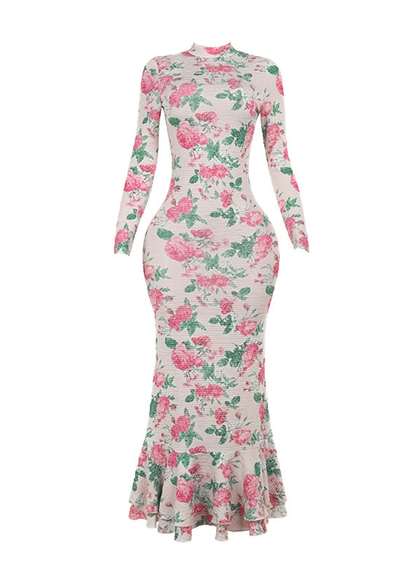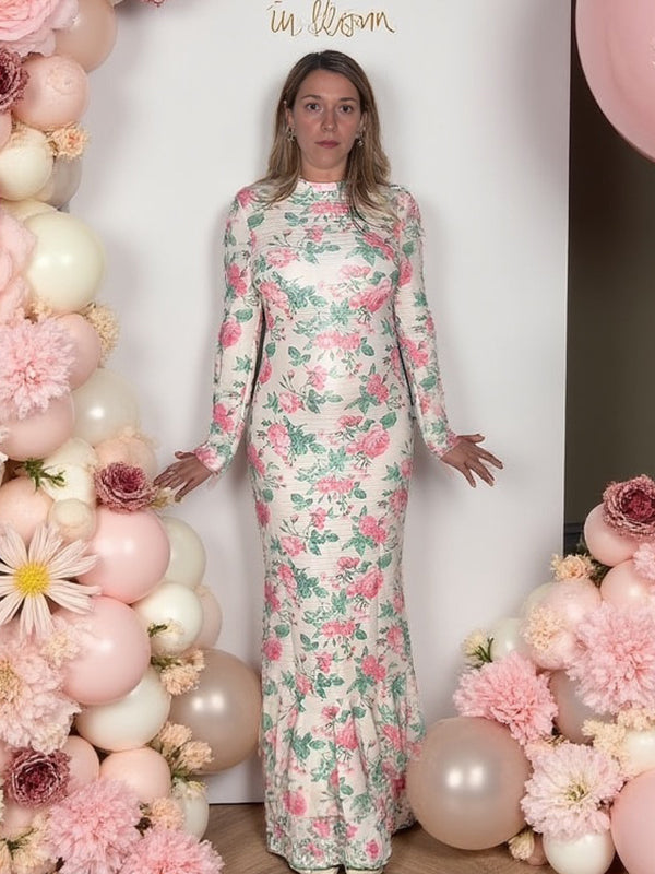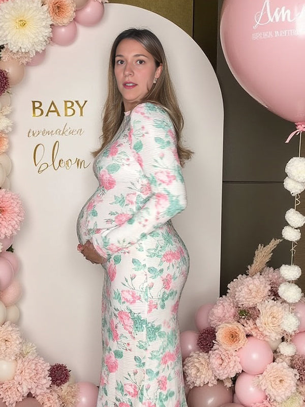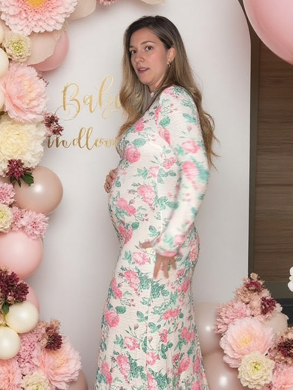 Momyknows Beige Floral Textured Ruffle Mermaid Elegant Maternity Maxi Dress