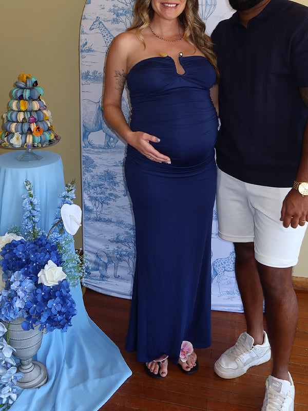 Momyknows Blue Buckle Ruched Tube Baby Boy Shower Maternity Maxi Dress