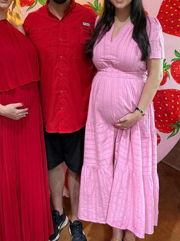 Momyknows Pink V Neck Ruched Splicing Maternity Baby Shower Maxi Dress