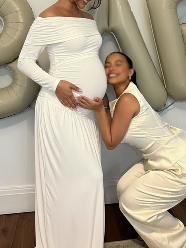 Momyknows White Off Shoulder Ruched Side Slit Maternity Maxi Dress