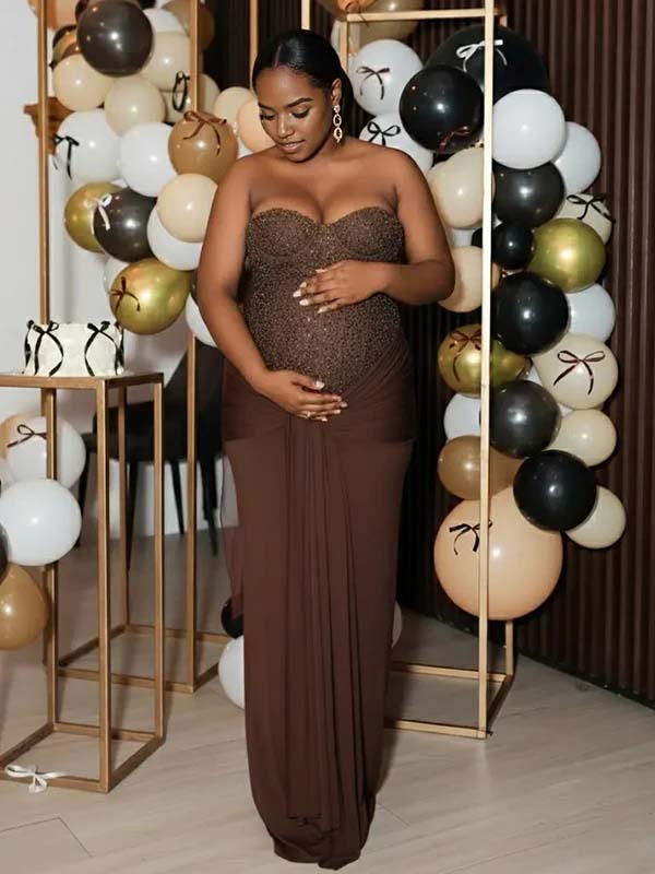 *1/13 PRE-ORDER* Momyknows Sequin Bandeau Ruched Knot Draped Bodycon Maternity Maxi Dress