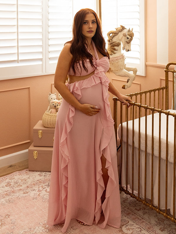 Momyknows Pink Ruffle 3D Flower Cut Out Halter Neck Elegant Maternity Maxi Dress