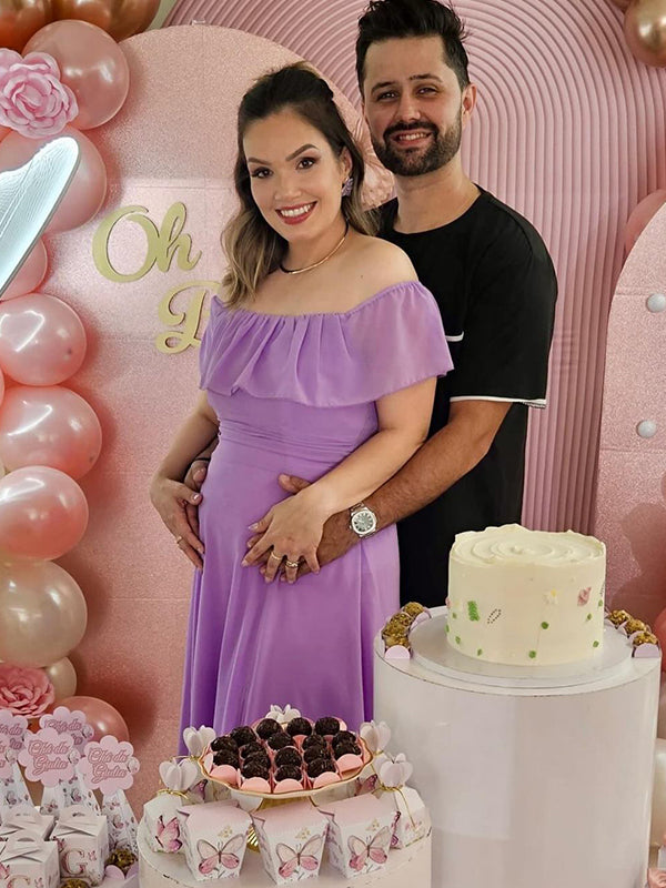 Momyknows Flowy Chiffon Off Shoulder Ruffle Falbala Side Slit Big Swing Elegant Evening Gown Maternity Photoshoot Baby Shower Maxi Dress