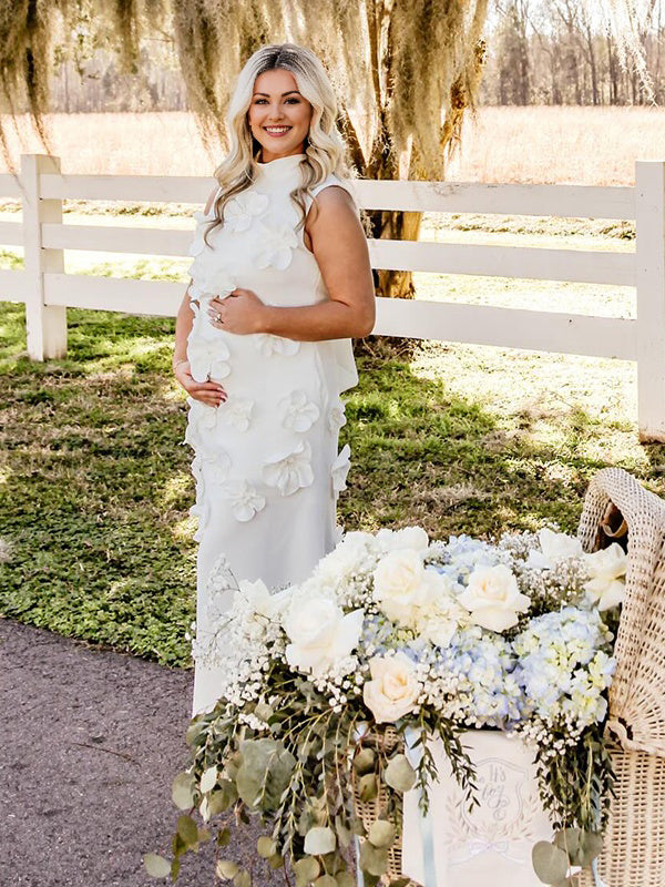 Momyknows 3D Flowers Band Neck Back Bow Photoshoot Baby Shower Maternity Maxi Dress
