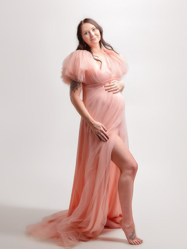 Momyknows Pink Tulle Ruffle Swing V-neck Slit Photoshoot Plus Size Gown Maternity Maxi Dress