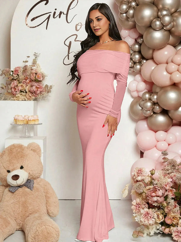 Momyknows Mesh Off Shoulder Ruched Mermaid Elegant Maternity Maxi Dress