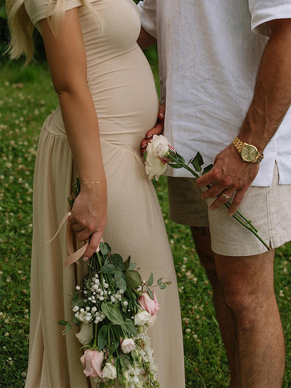 Momyknows Apricot Off Shoulder Ruched Backless Boat Neck Cap Sleeve Splicing Elegant Gender Reveal Maternity Maxi Dress