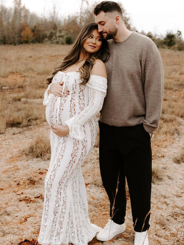 Momyknows White Off Shoulder Lace Bandeau Tie Front Mermaid Bandage Gender Reveal Maternity Maxi Dress