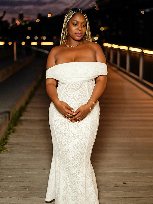 Momyknows Lace Off Shoulder Ruched Backless Bodycon Maternity Maxi Dress