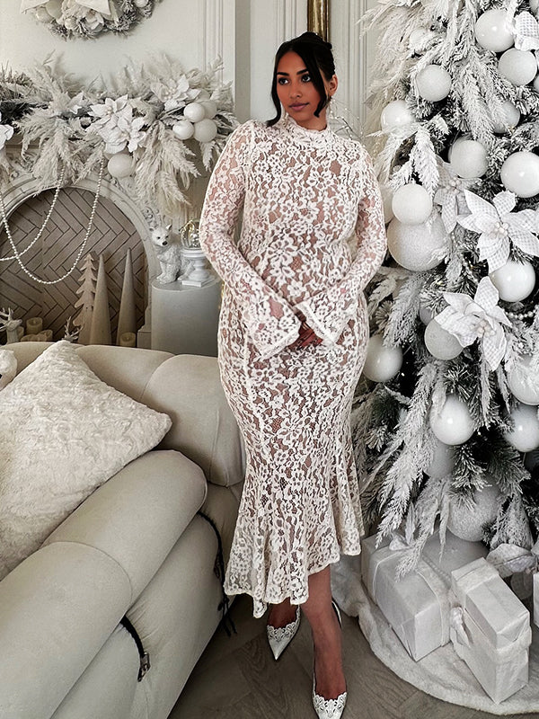 Momyknows White Lace Ruffle Mermaid Flare Sleeve Maternity Midi Dress