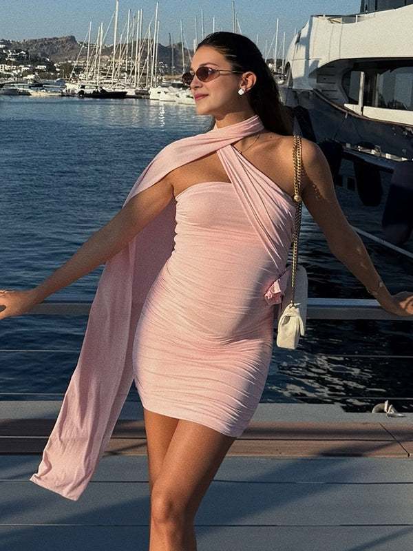 Momyknows Apricot Irregular Neck Asymmetric Shoulder Bandage Bodycon Gender Reveal Maternity Mini Dress