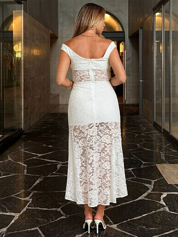 Momyknows White Sleeveless Boat Neck Lace Side Slit Maternity Photoshoot Maxi Dress