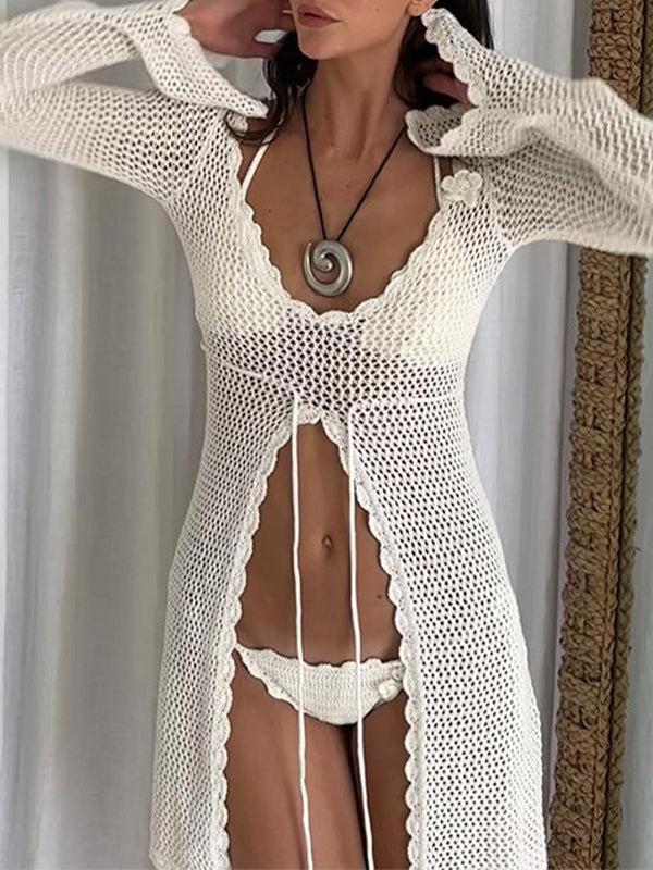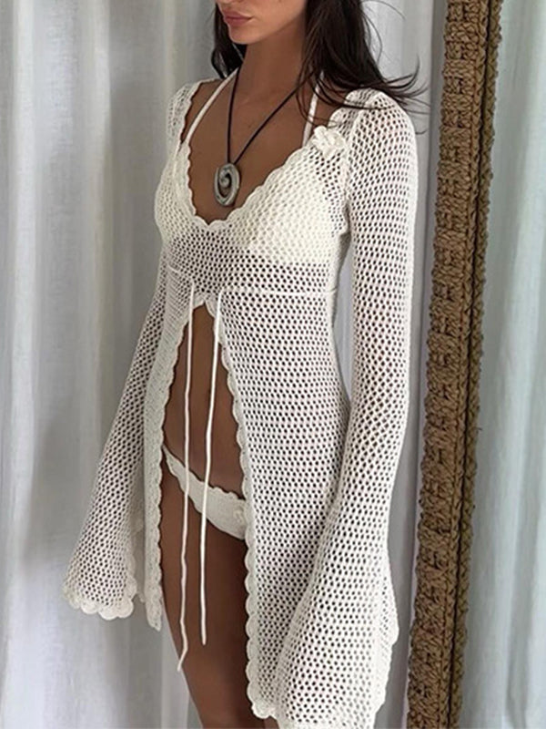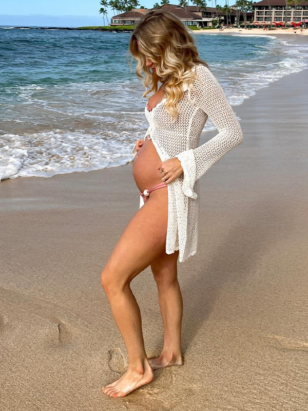 Momyknows White 2-in-1 3D Flower Tie Ruffle Slit Flare Sleeve Fashion Beach Vacation Cover Up Photoshoot Maternity Mini Dress