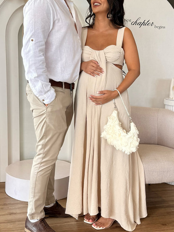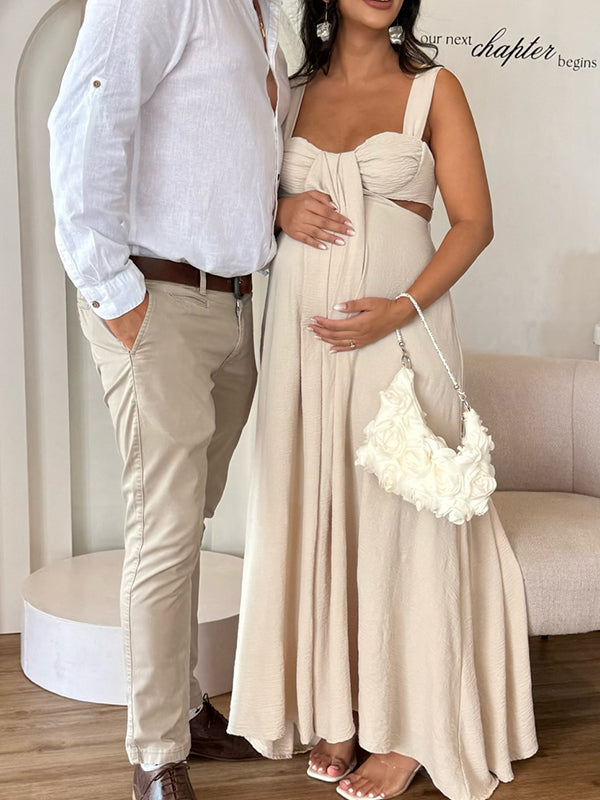 Momyknows Beige Tank Cut Out Ruched Backless Wide Leg Chic Maternity Jumpsuit