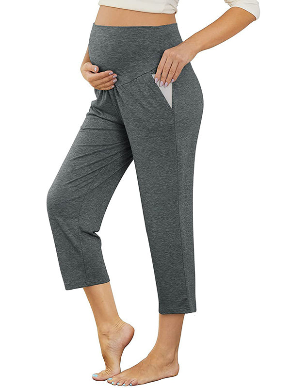 Momyknows Solid Color Over The Belly Pockets High Waisted Workout Cozy Straight Pants Casual Maternity Trousers