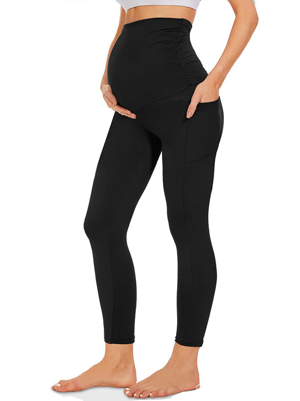 Momyknows Solid Color Over The Belly Pockets High Waisted Workout Cozy Straight Pants Casual Maternity Trousers