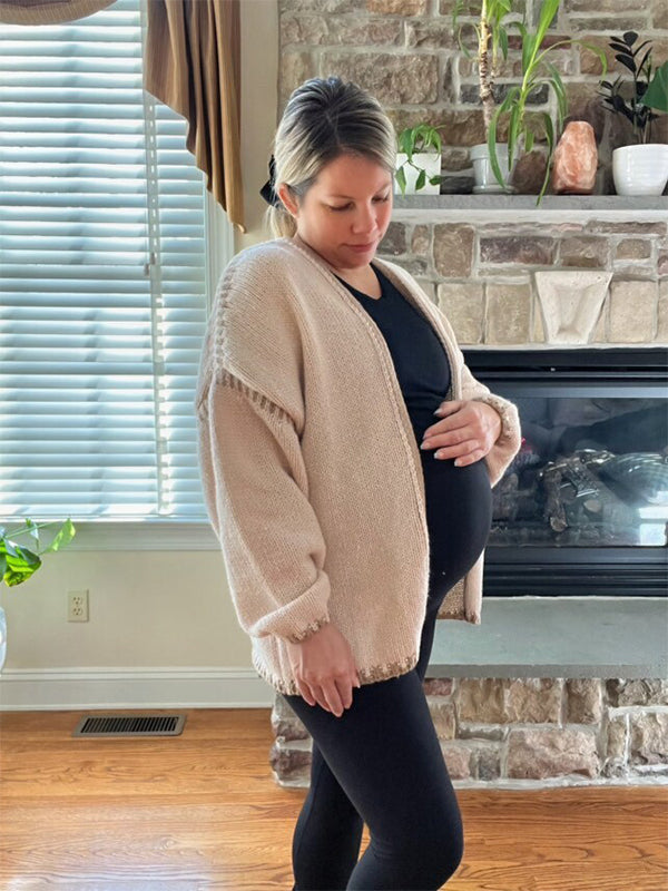 Momyknows Lines Hit Color Lantern Sleeve Fashion Daily Photoshoot Maternity Sweater Cardigan