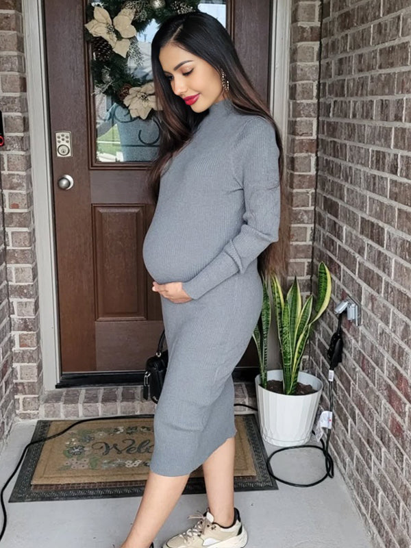 Momyknows Grey High Neck Crochet Maternity Sweater Baby Shower Midi Dress