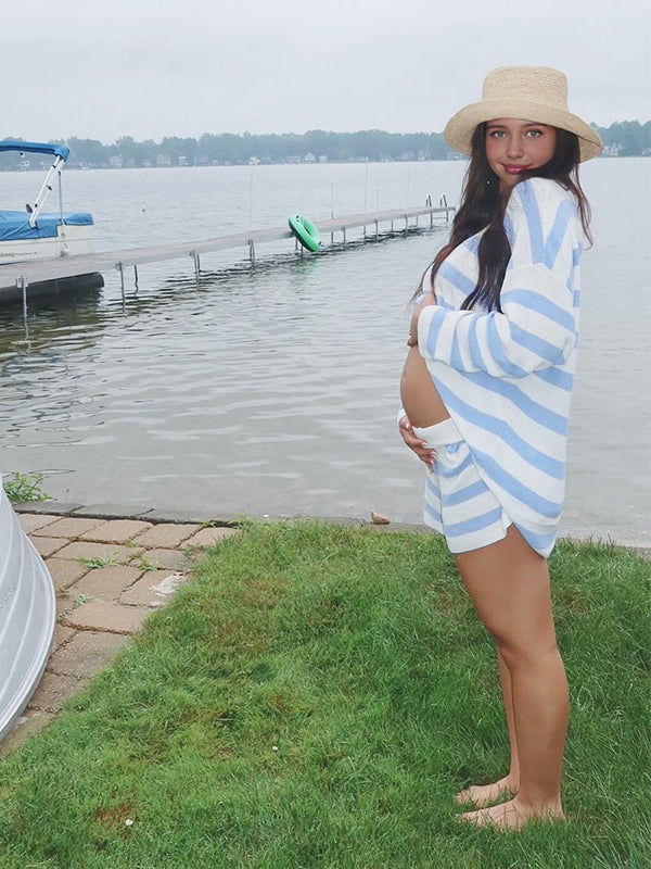 Momyknows Light Blue Knit Striped Daily Maternity Short Outfit