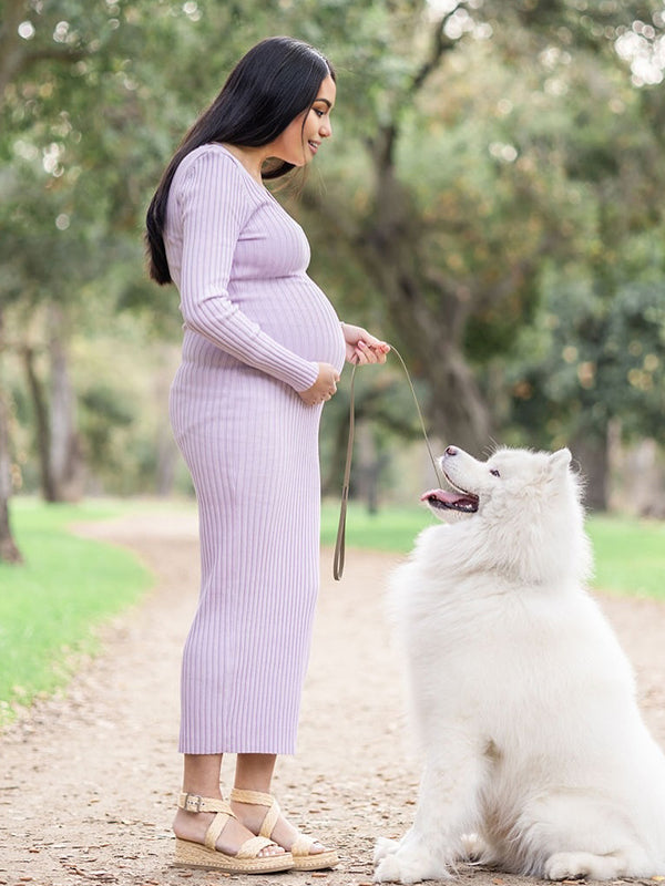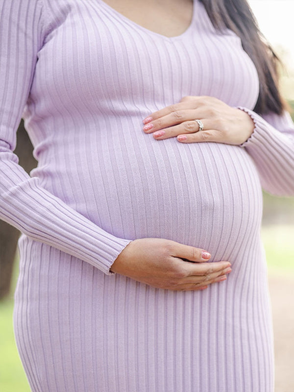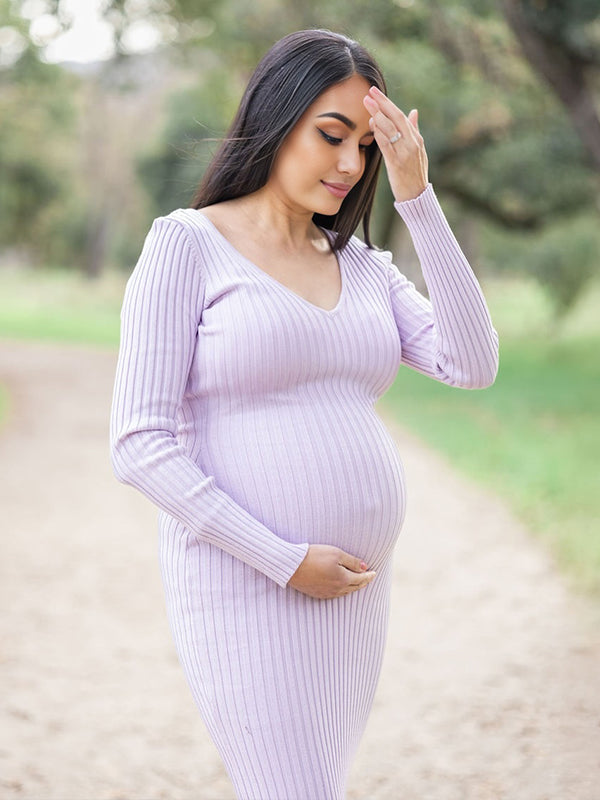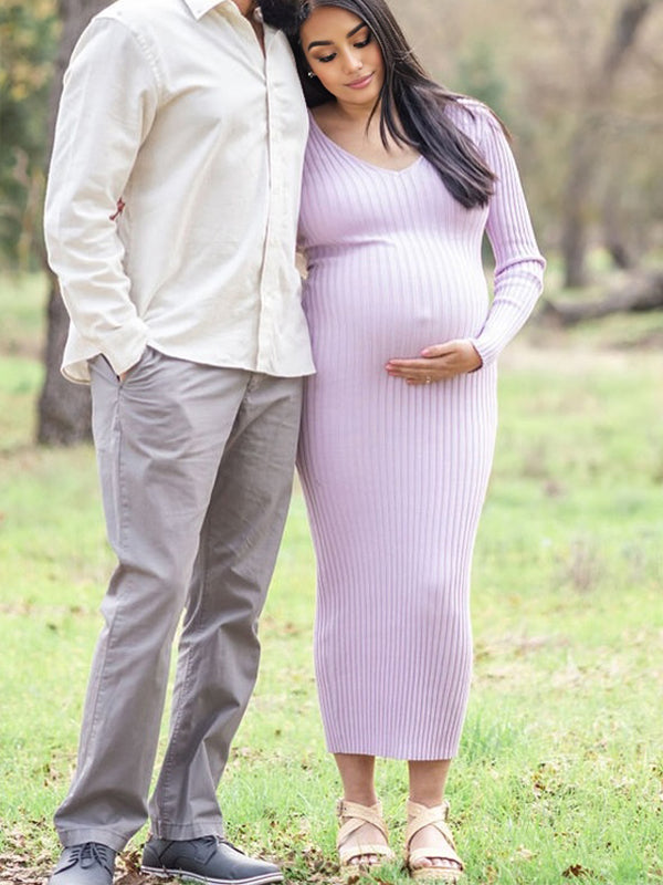 Momyknows Light Purple V Neck Crochet Trench Maternity Photoshoot Sweater Maxi Dress