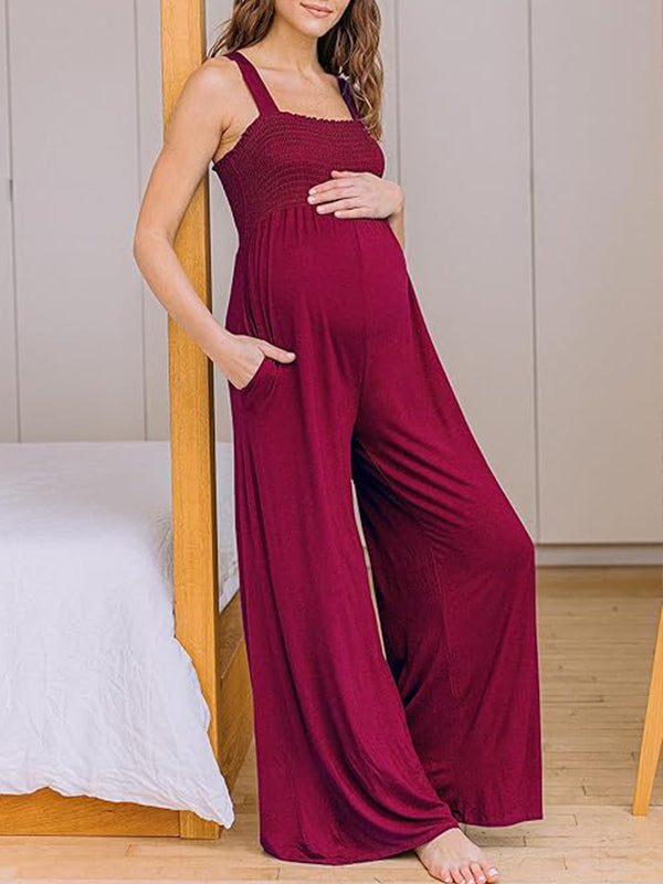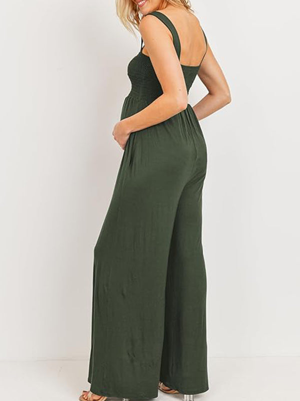 Momyknows Smocked Tank Pockets Wide Leg Comfy Romper Casual Maternity Jumpsuit