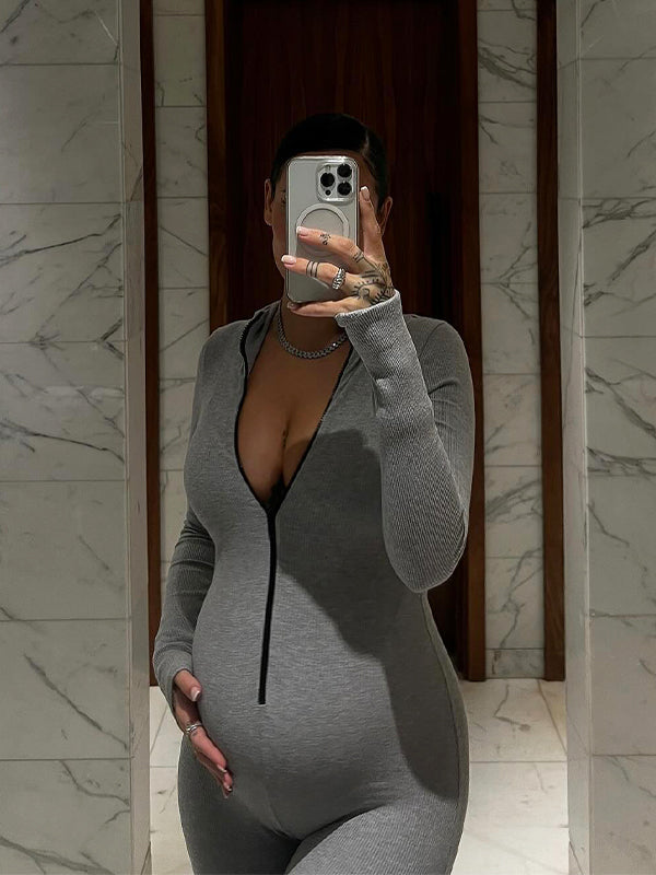 Momyknows Zipper Solid Color Bodycon Daily Casual Yoga Sport Exercise Maternity Jumpsuit
