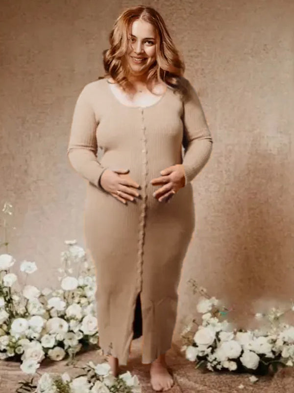 Momyknows Khaki Single Breasted Crochet Maternity Photoshoot Sweater Maxi Dress