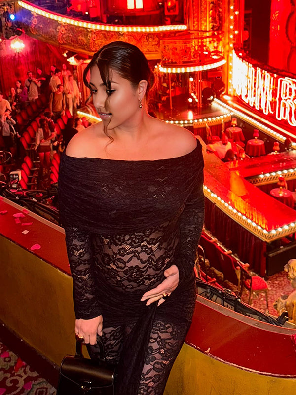Momyknows Black Off Shoulder Lace Spliced Maternity Photoshoot Jumpsuit