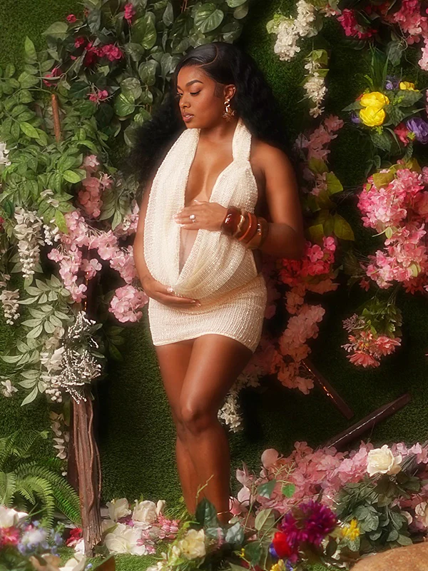 Momyknows White Plunging Neckline Knit Sheer Backless Photoshoot Maternity Mini Dress