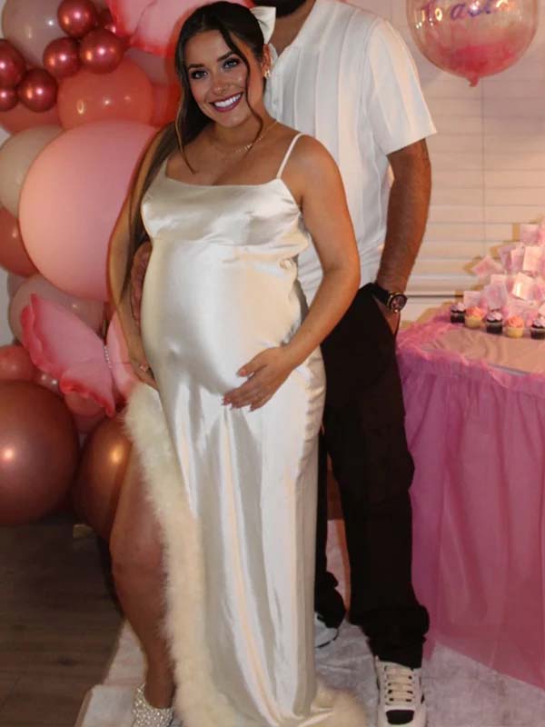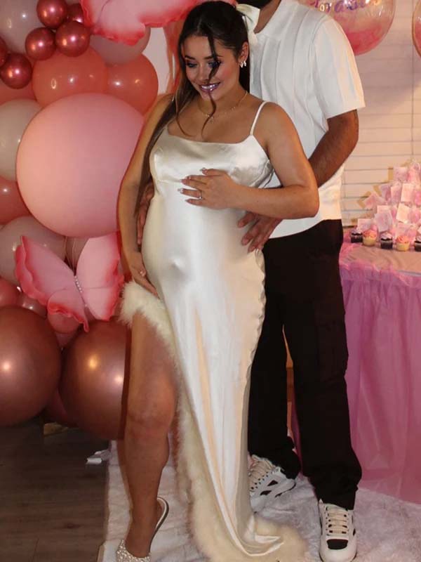 Momyknows White Spaghetti Strap Side Slit Feather Trim Maternity Baby Shower Maxi Dress