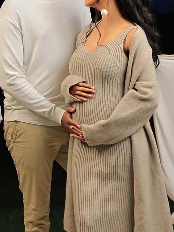 Momyknows Light Coffee Knit Tank Dress And Long Cardigan Two Piece Set Maternity Maxi Dress