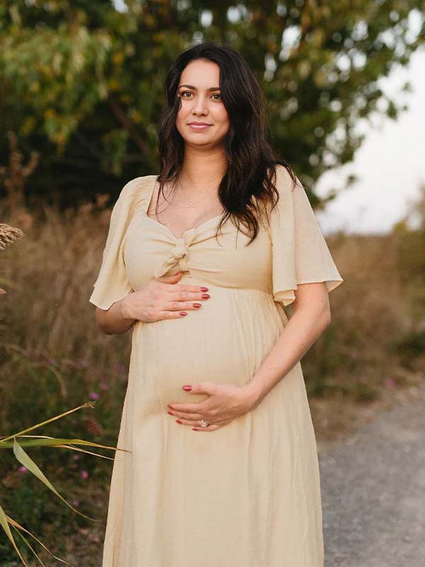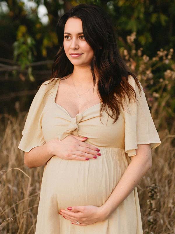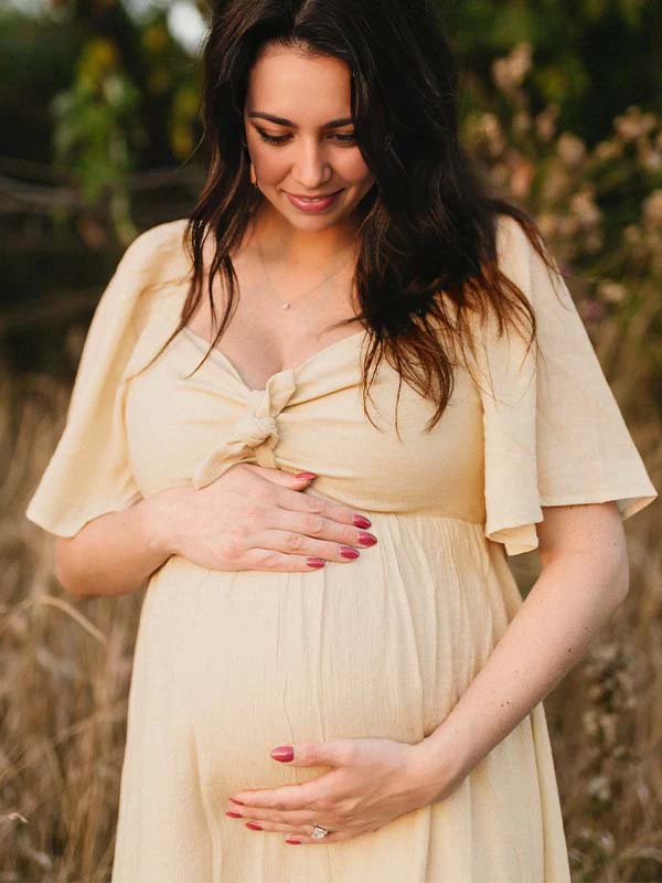 Apricot Bow Flutter Sleeve Solid V-neck Flowy Photoshoot Maternity Maxi Dress