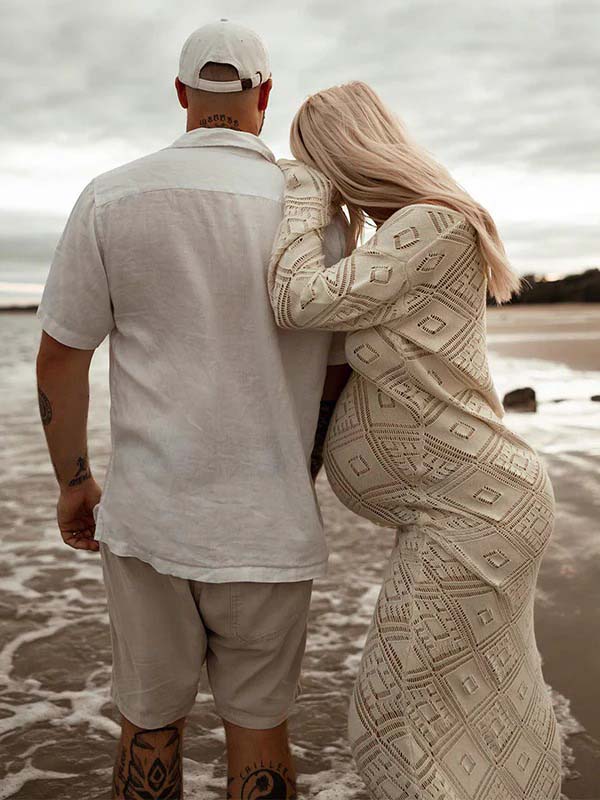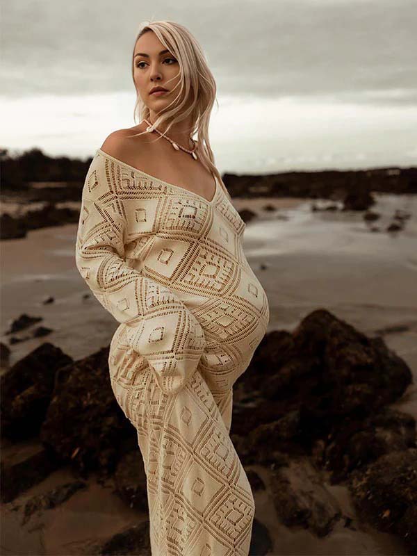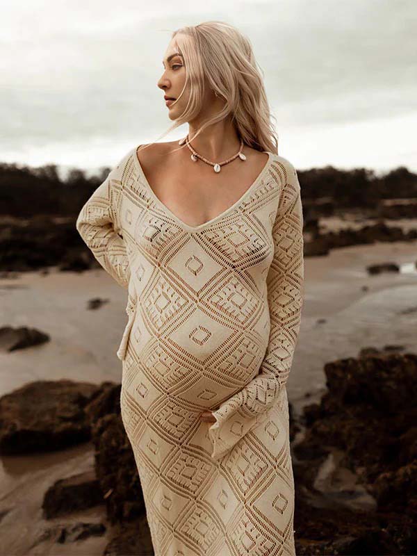 Apricot Cut Out Sheer Knit Photoshoot Maternity Maxi Dress