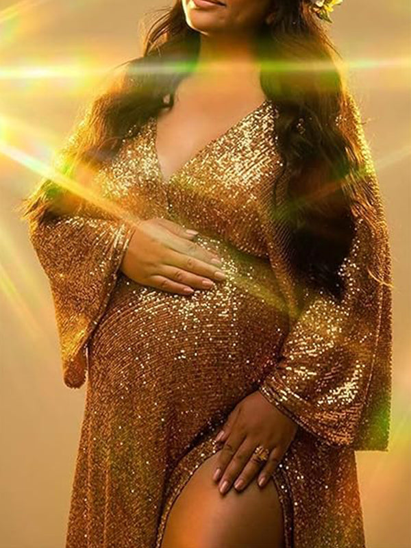 Golden Sequin Side Slit Flare Sleeve Maternity Photoshoot Maxi Dress