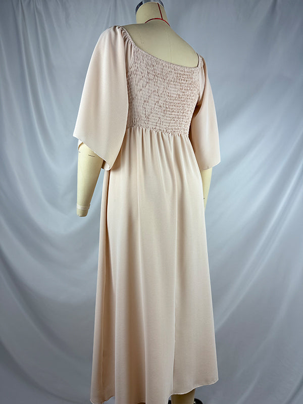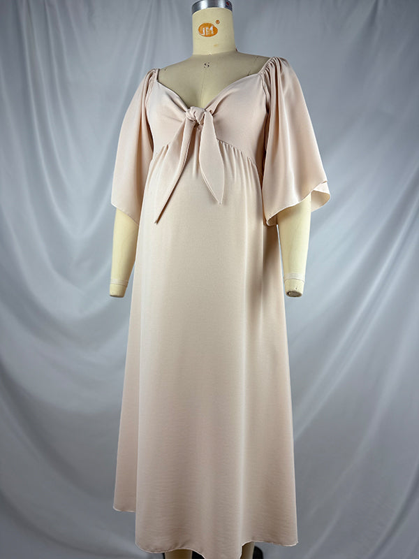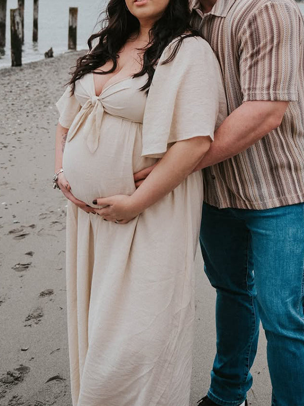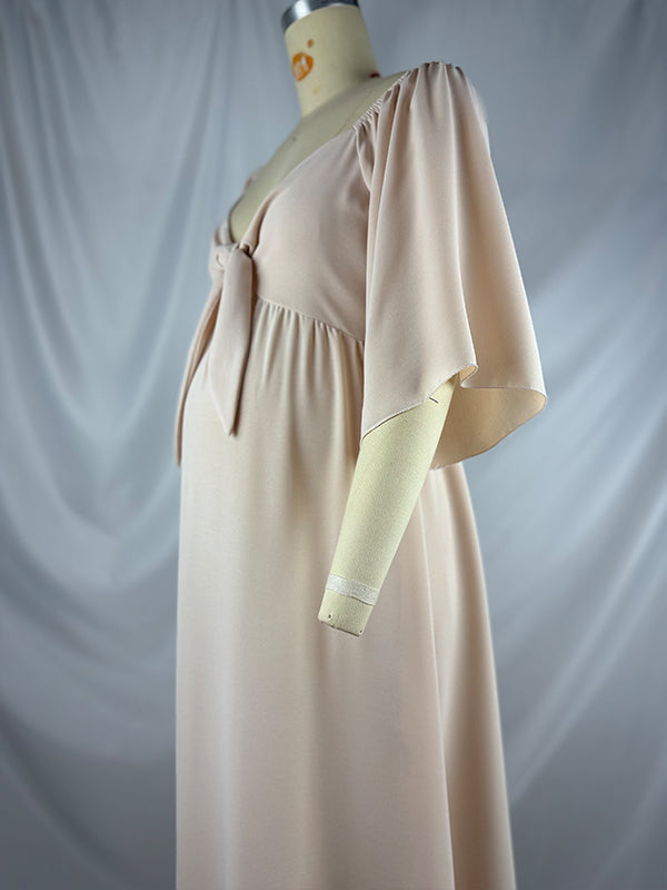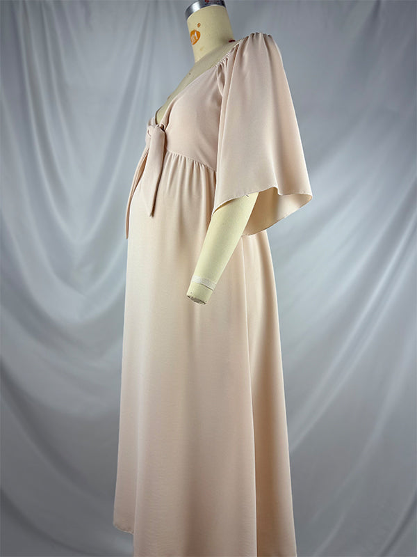 Momyknows Beige Bow Flutter Sleeve Plus Photoshoot Maternity Maxi Dress