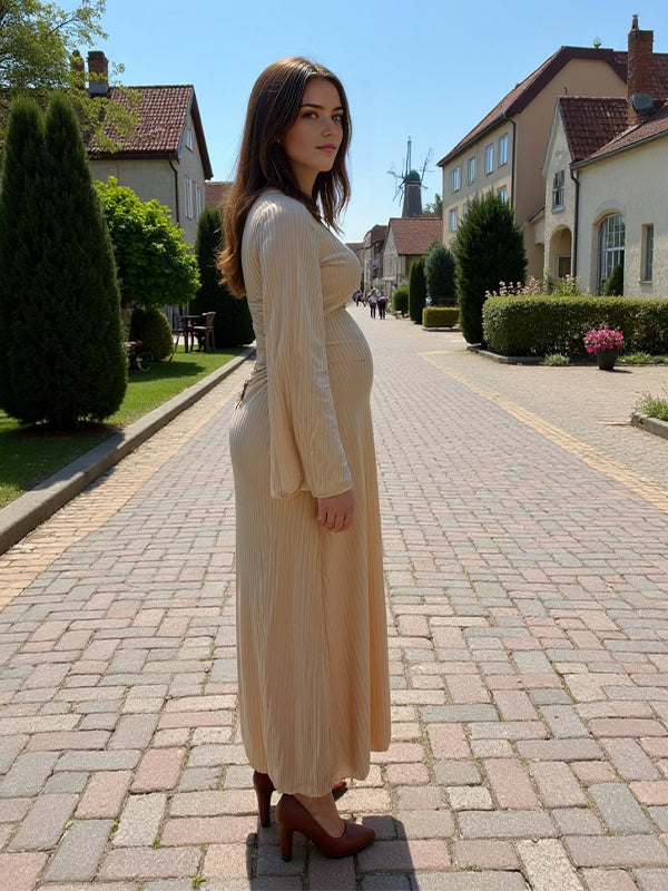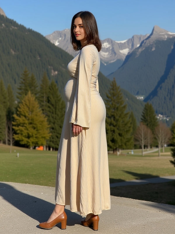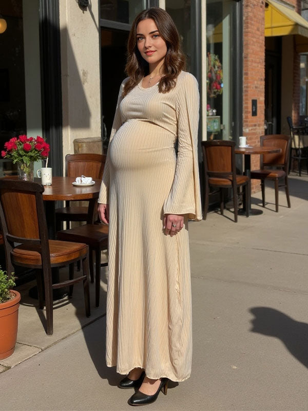 Momyknows Beige Knit Back Tie U-neck Flare Sleeve Elegant Baby Shower Maternity Maxi Dress