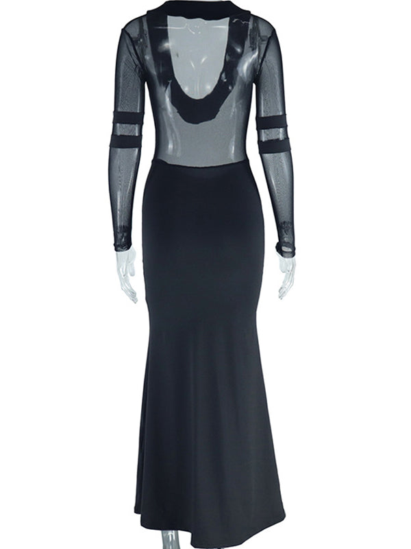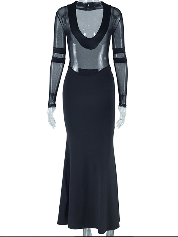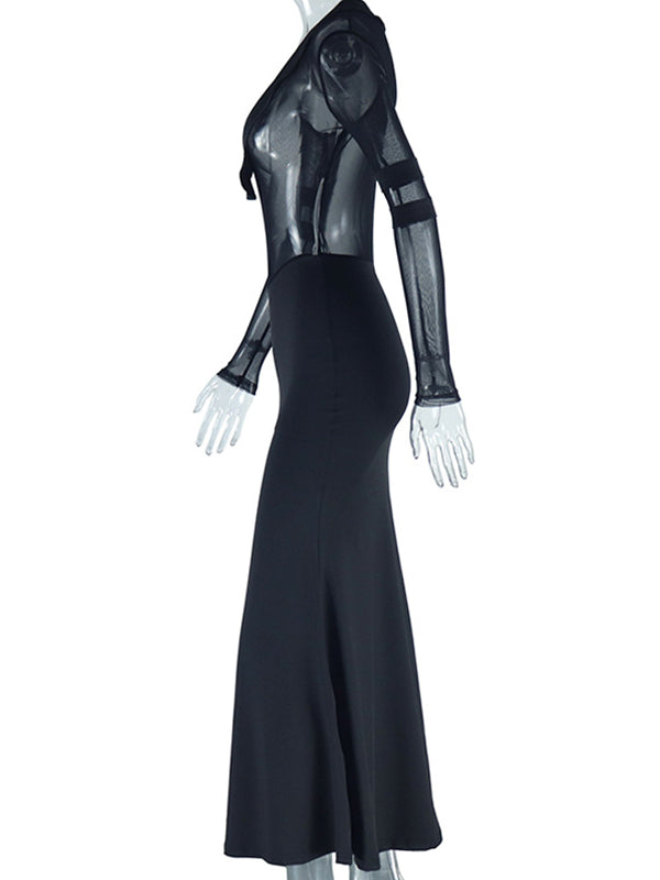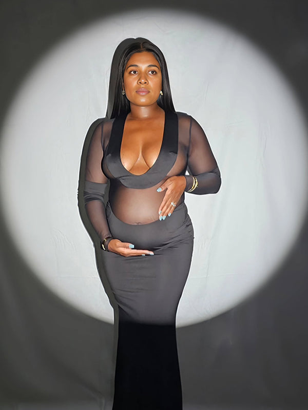 Momyknows Black Mesh Patchwork Plunging Neckline Mermaid Bodycon Sheer Elegant Maternity Photoshoot Maxi Dress