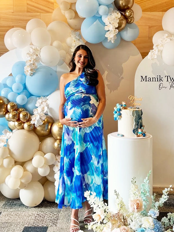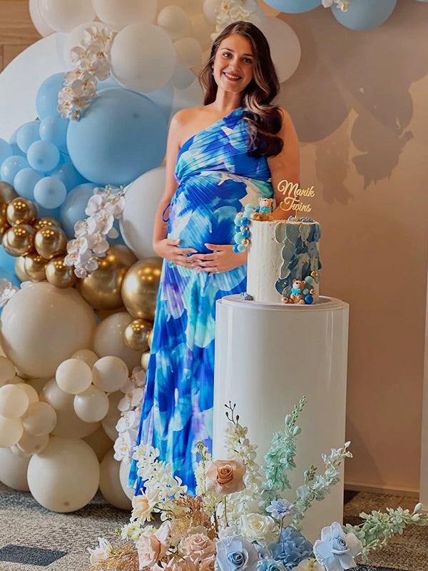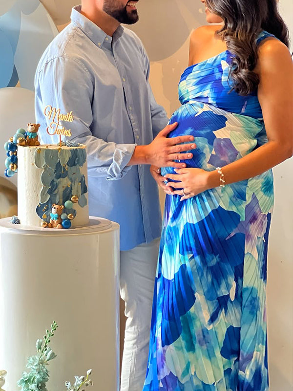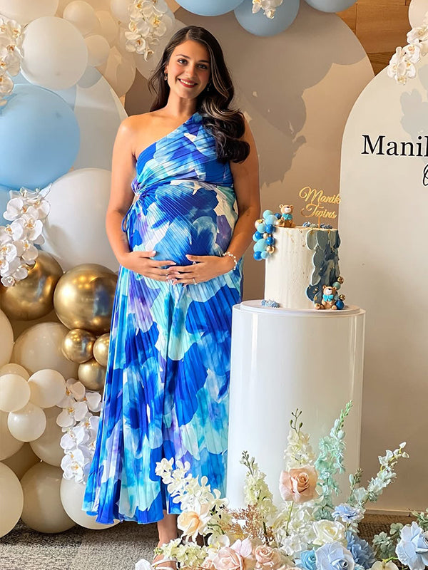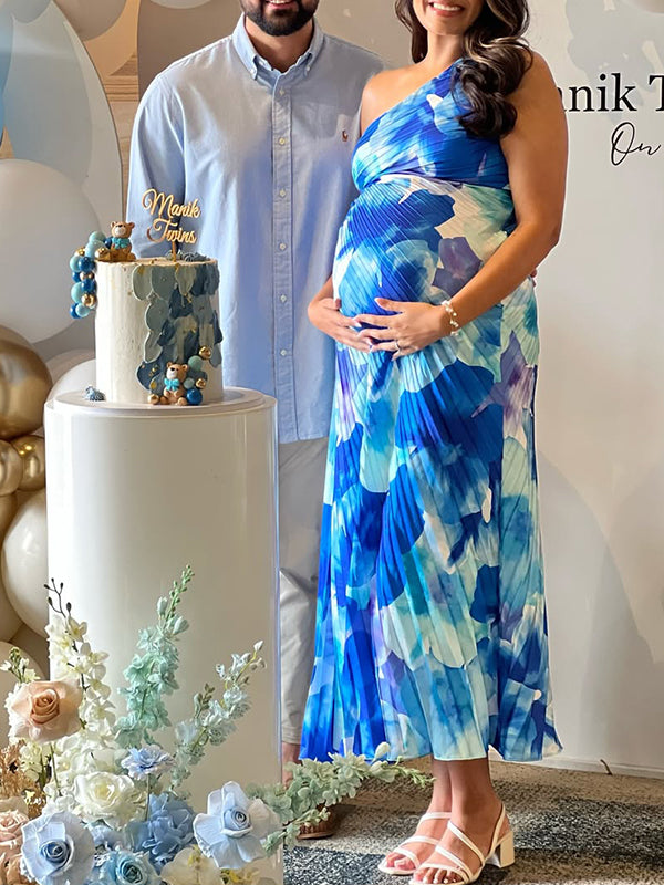 Momyknows Blue Floral One Shoulder Pleated Cut Out Maternity Maxi Dress