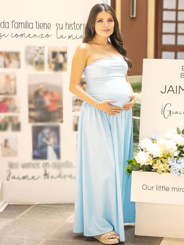 Momyknows Blue Ruched Bandeau Big Swing Strapless Elegant Maternity Maxi Dress
