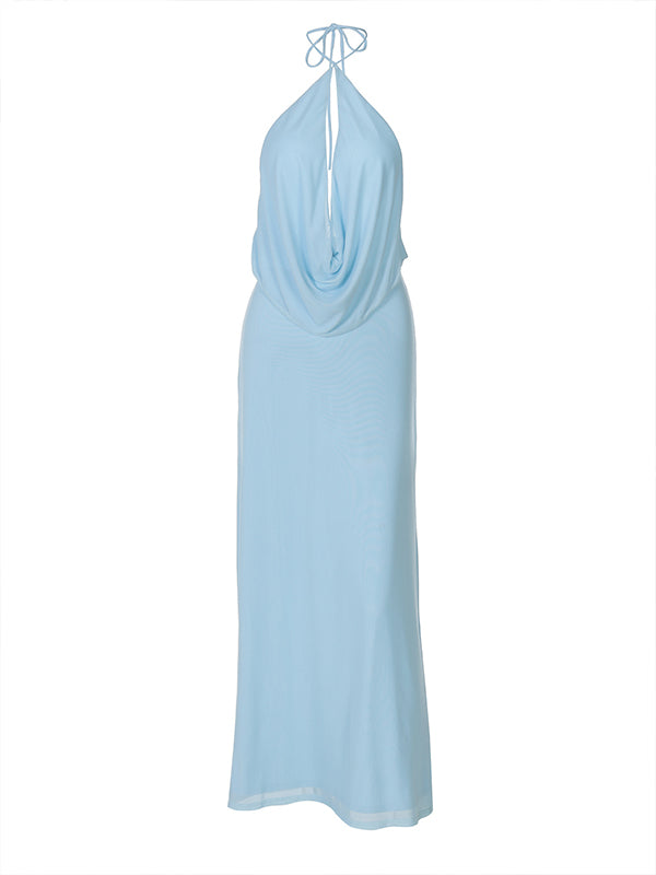 Momyknows Blue Ruched Cami Backless Cowl Neck Bodycon Maternity Maxi Dress