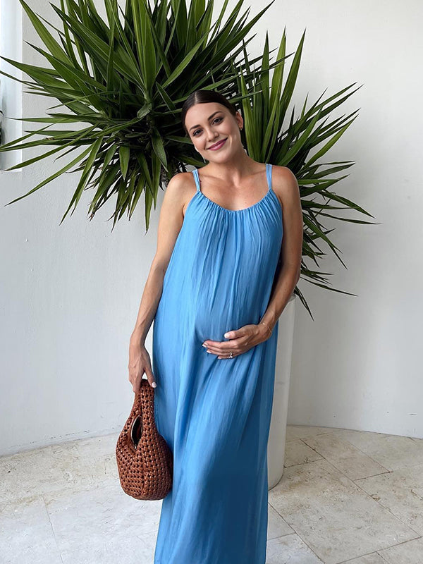 Momyknows Blue Spaghetti Strap Ruched Maternity Photoshoot Maxi Dress